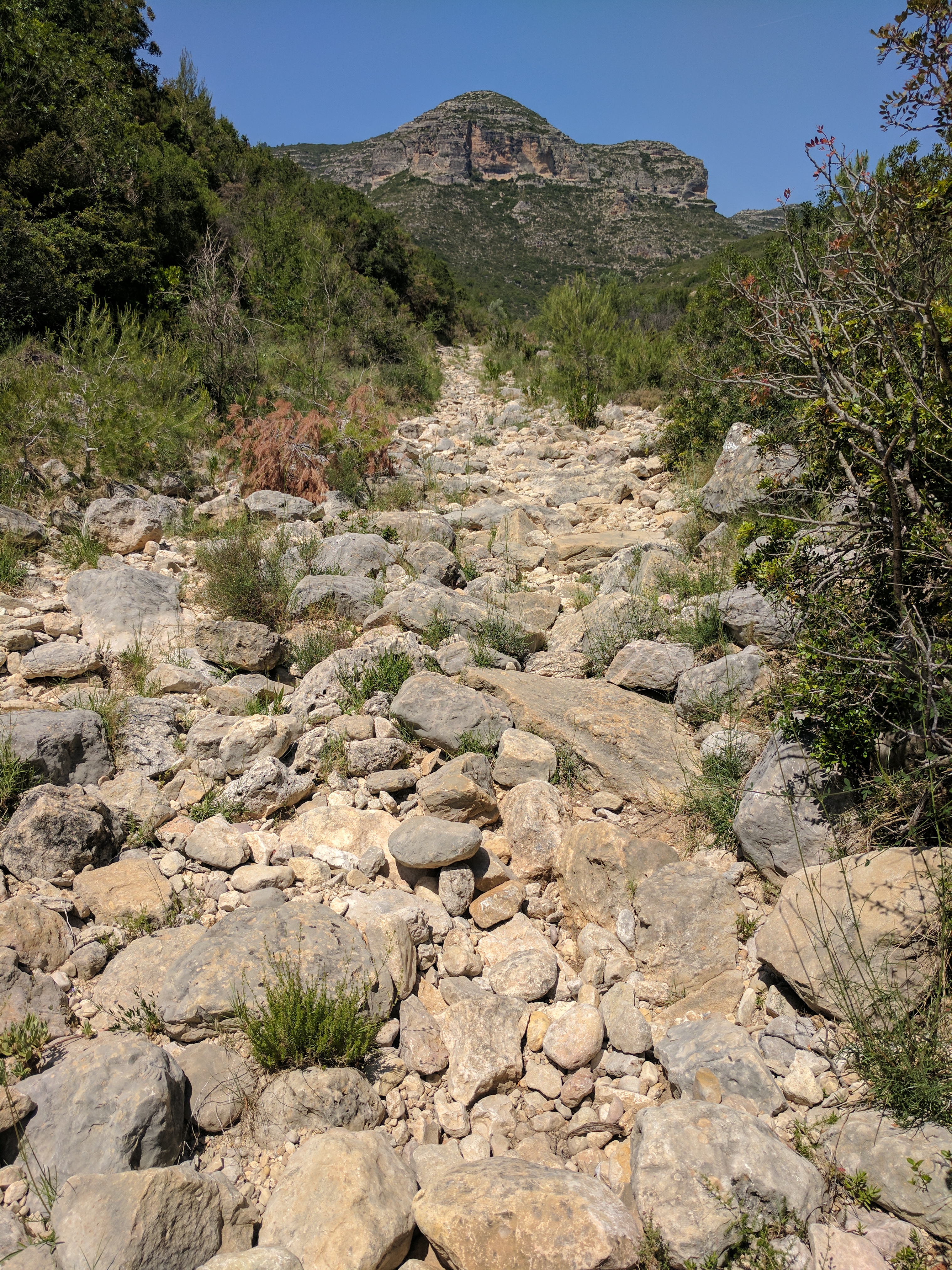 The following day, I met a guy from Tokyo at breakfast that was on pilgrimage on the Camino that runs through Moixent, but he was going to take a bus for a bit because he was having knee issues. After breakfast and a stop in town for groceries, I backtracked to the spot where the GR7 enters the hills on the two-day stretch towards Cortes de Pallas. I loaded up on water and tied an extra 1.5 litre bottle to my pack, knowing that it would be well over 30km for each of the two days to Cortes de Pallas, and I knew it would be warm. Hate carrying that much weight, but sometimes you can’t help it. The path immediately started throwing up challenges, with it following the dry creek bed at the bottom of a canyon. It was very slow going as most of the walking was on river rock.