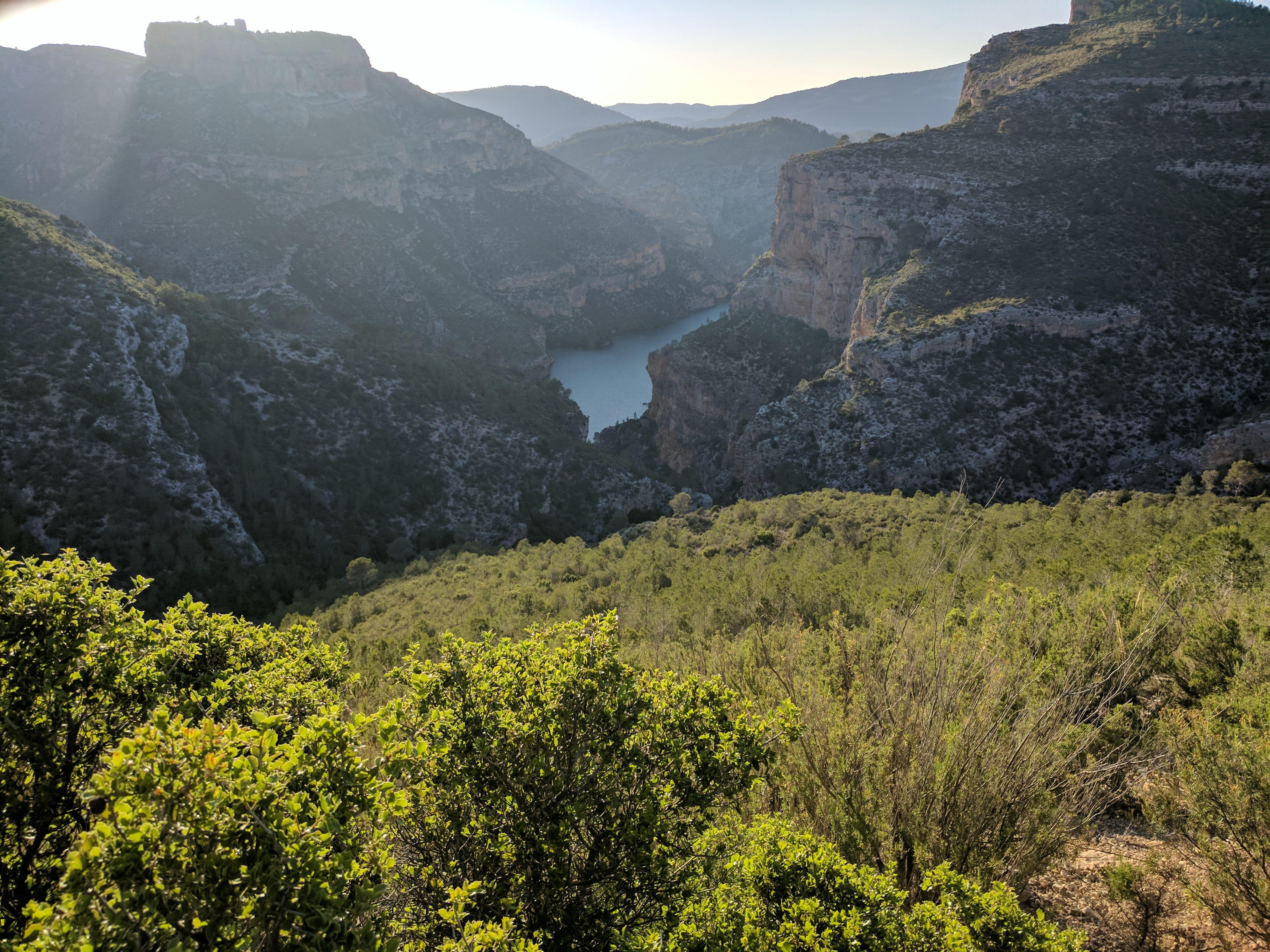 Since I wasn’t able to finish my goal from the day before, I knew that it was going to be a very long day into Cortes de Pallas. But, it was longer than anticipated. The road/trail conditions were not as bad as the day before, but the distance combined with the heat and diminishing water supply took its toll. In my tired state, I also took and wrong turn and ended up adding about 3km to an already ridiculous day. The forest service roads followed the hilltops out of camp before diving into a valley, and eventually climbing again near some tower-shaped rocky outcrops. Once through the outcrops and into the saddle, I bumped into two Civil Protection workers that were repairing cracks in a water trough used for fire protection. The road then made a gradual drop down to a paved section with switchbacks, where I came across four Forestry Services workers that were clearing​ brush near the road. Once down on the valley floor, the road was relatively straight to the other end of the valley, where the state of the road deteriorated before turning into a trail at the cliff banks of the Cortes de Pallas Reservoir. The reservoir valley was really stunning, with high rocky cliffs all around, and the remains of a castle on the highest point above the water.