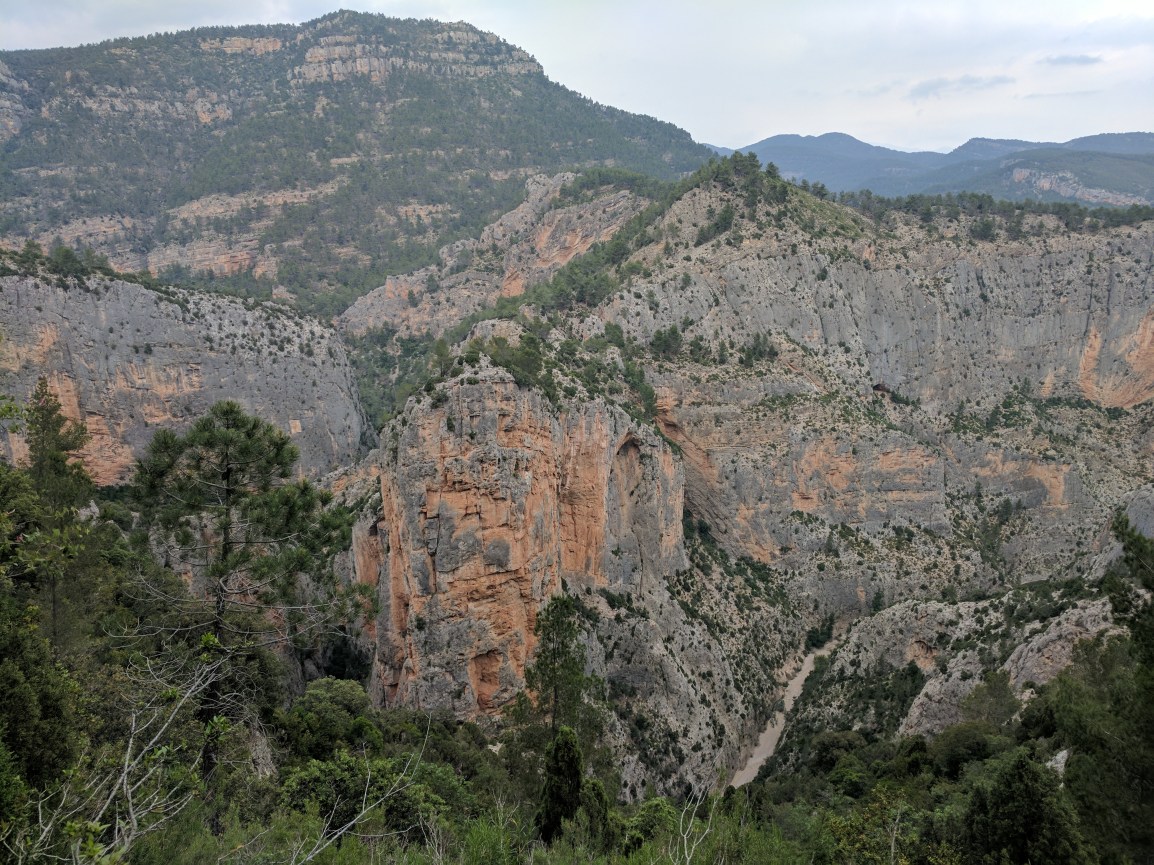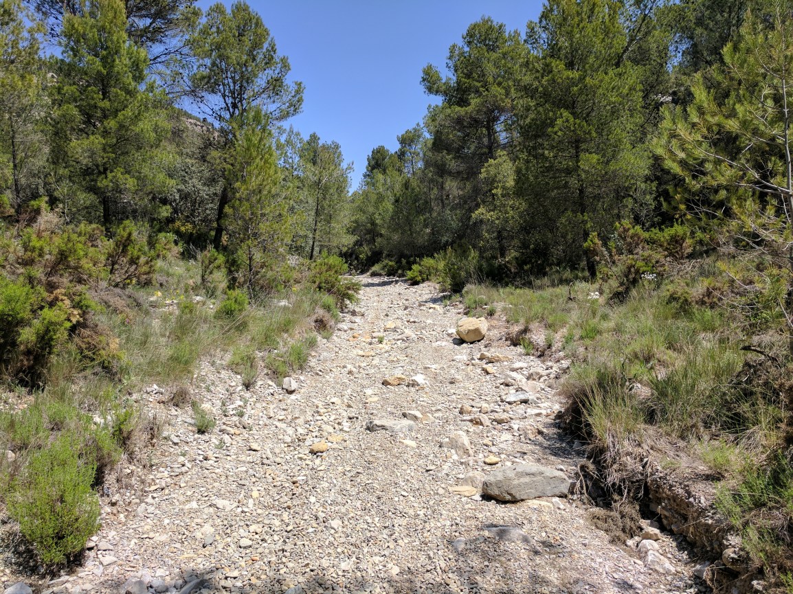 Leaving Chelva, I stopped at the pharmacy to get another roll of tape for my feet, which were still feeling awful. I sat on a park bench and taped my feet before heading off. The dirt roads cut through olive and almond orchards before entering the hills. The GR7 then had a short trail stint along a forested creek before rejoining the road. While the road was generally in good shape, it eventually joined a dry riverbed, which was entirely rocks. However, the riverbed was largely soft, so it wasn’t so bad to walk through.