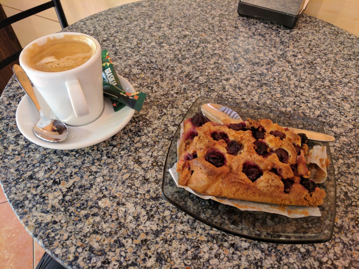 The day from Pauls to Rasquera was mediocre. The first half of the day was decent, with farm roads leading out of the foothills. Those roads eventually ran into the Erbe river, which looked amazing on approach. I was excited about the river landmark, but that was tempered by a significant stretch of walking along the main highway. There was a lot of traffic, and it was a poor place to be walking. I was looking forward to getting off the highway and back onto the dirt roads leading into Rasquera. Since these roads (and a few short trail sections) followed the river, they offered some views of the river, but also went through some unused industrial and farming spots. It was a warm day, and the people were out in Rasquera enjoying the sunshine when I arrived. It was a good opportunity to get some groceries, and a refill of sunscreen at the pharmacy. I also stopped at a bakery for a coffee and cherry tart. The cherry tart was so good that I got a big piece for take-away.