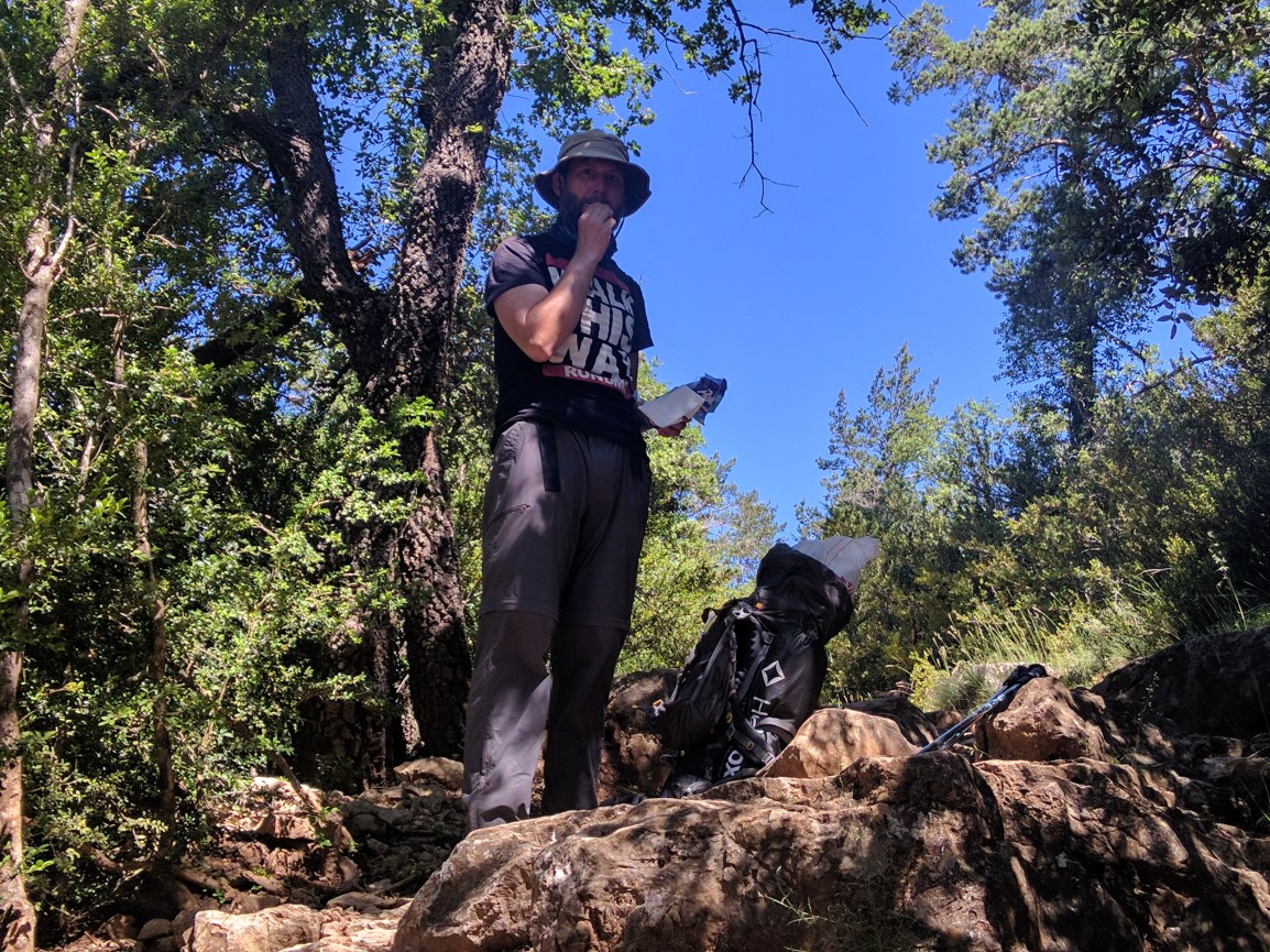 After the waterfall area, the trail went up a steep embankment and onto a dirt road that went on a for while. It got a bit monotanous on that road, but I reached the point where the E4 path departs from the GR7 for good. After over 1600km on the GR7, it was time for us to part ways. I stopped just after the turn off, and had a chocolate cookie break in tribute.