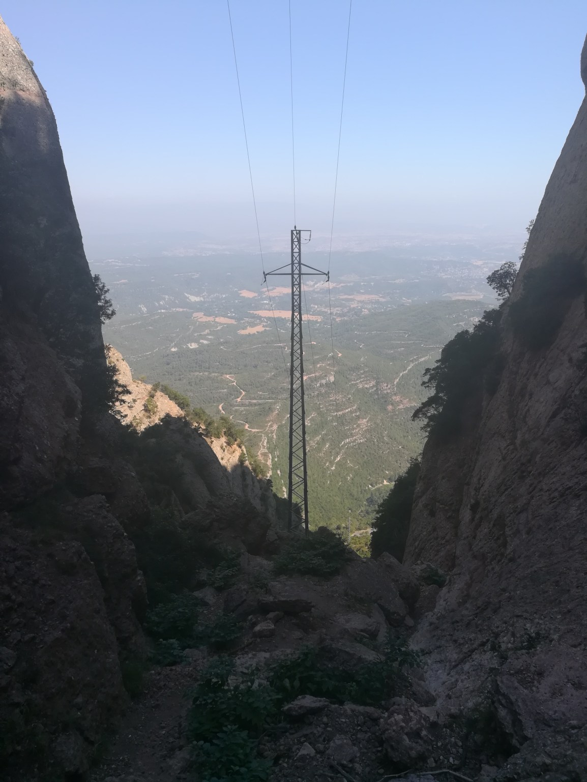 Vacating my hotel room in Montserrat, I started the outward climb. The monastery area is not at the top, so I followed the signs to go towards the GR172/GR5 over the top. I planned to take the shortest route down, but failed to realize that the shortest way was also the steepest. It was very steep, passing through the narrow gap between two rock columns where overhead power lines were running.