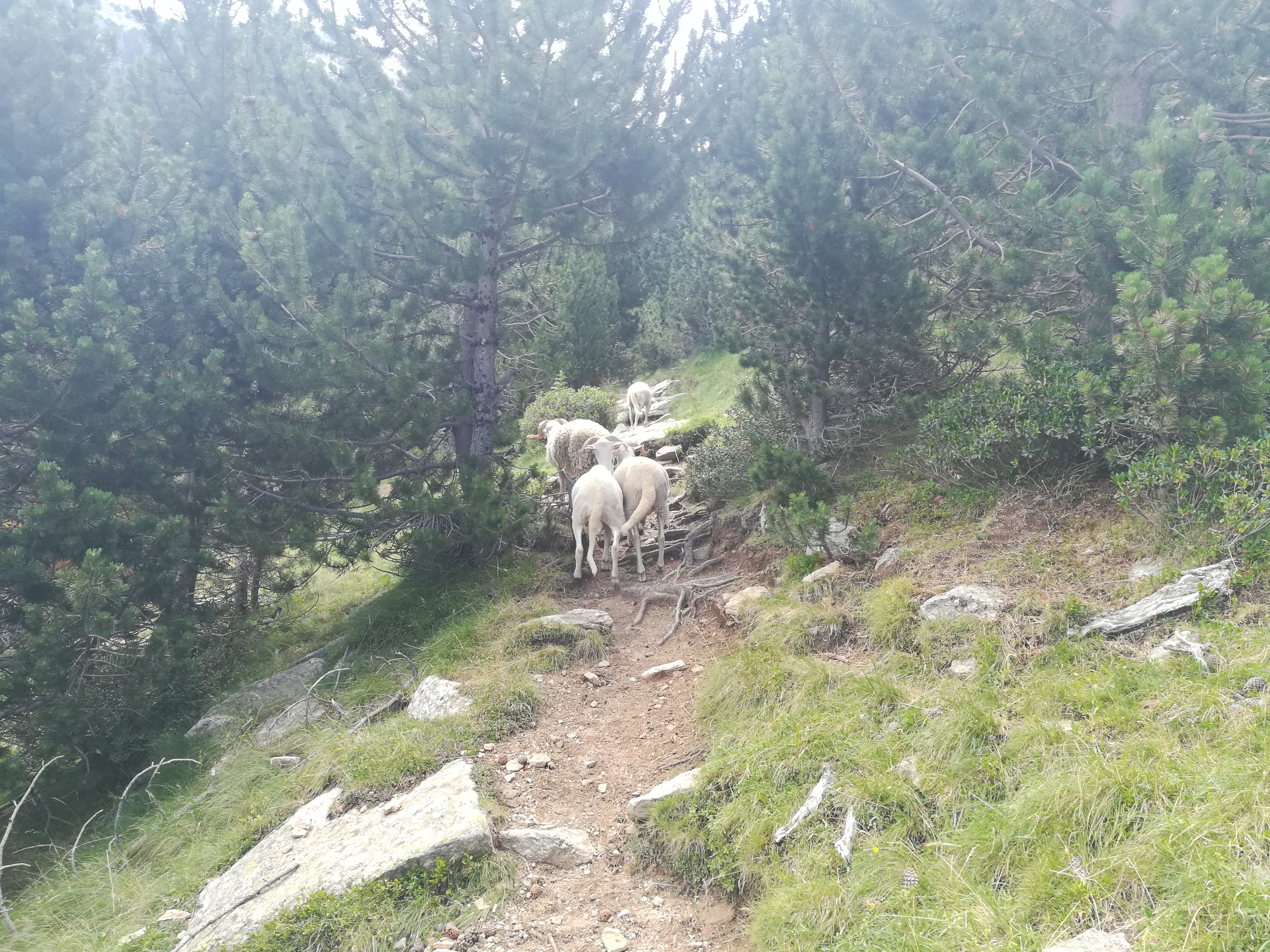 The next day was a long and difficult one, being the first day in the heart of the Pyrenees where the big mountains live. The trail out of Planes was relatively level, gradually working its way down to the bottom of a river valley. However, the climb out was the first of two monster climbs and descents on the day. The first climb was relentless, and about half way up a group of sheep started walking on the trail in front of me.