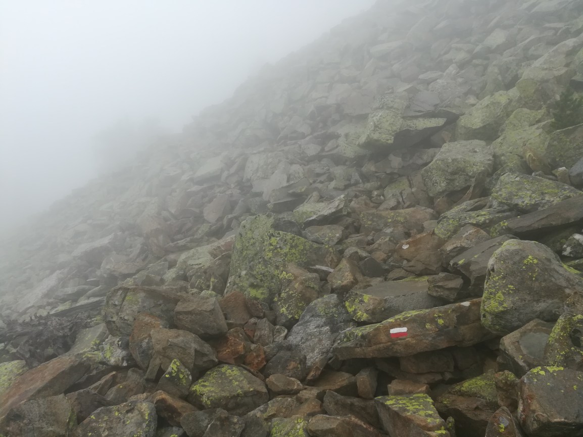 However, clouds were starting to build and the day turned a bit sour. Soon I was hiking in thick cloud with very limited visibility. After a while the lightning started (which is always unsettling) followed by rain. While crossing one of many large skree fields, I slipped and fell hard onto the rocks.