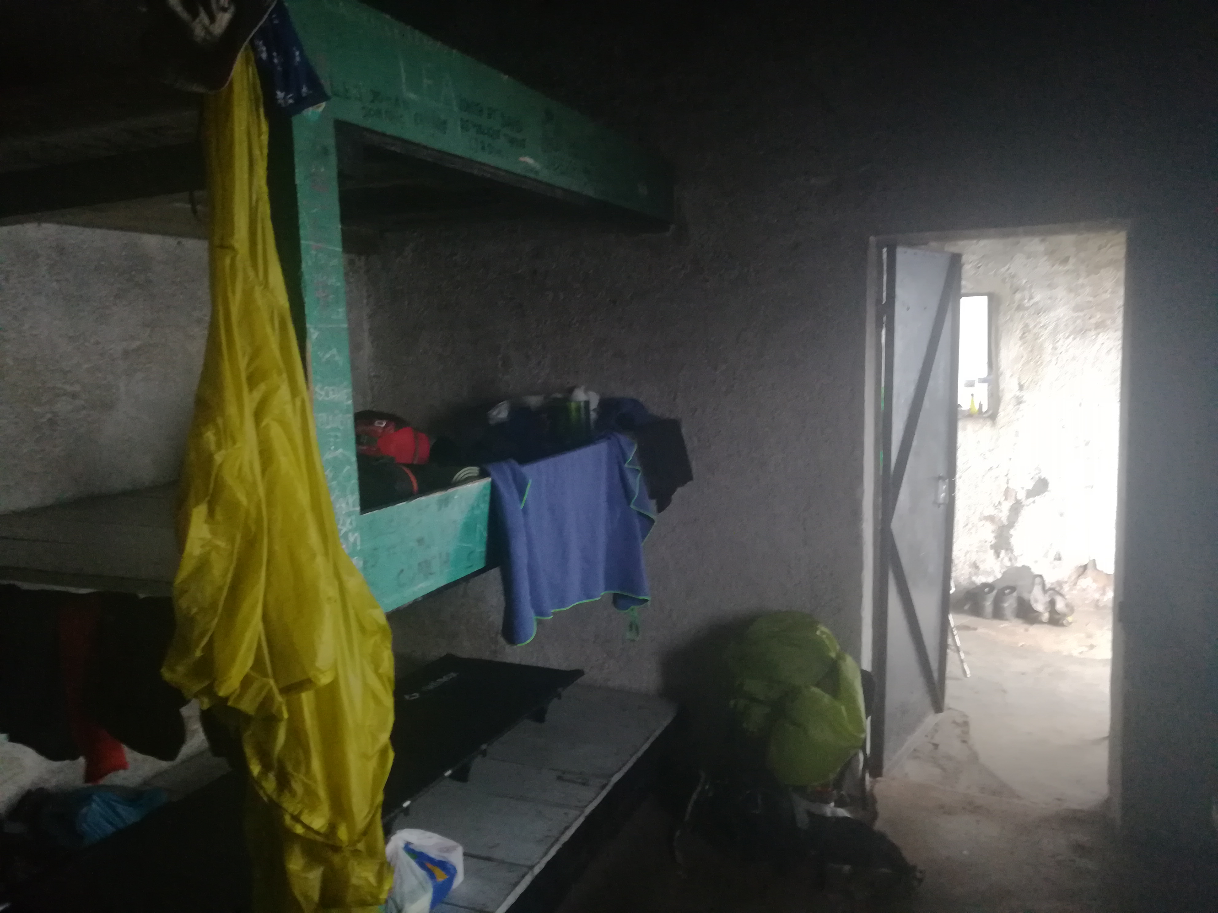After a cursory check to make sure that nothing was broken, it took me a few minutes to gather myself. I had a significant gash in my right knee that was bleeding, my left knee had made heavy contact but was not bleeding, and I had jammed or hyperextended the middle finger on my right hand. My finger soon started to bruise around the middle joint, and it swelled to where I could not bend it fully. My goal was to go another few kilometers to a full refuge, but I realized that I should go to the nearest hut and call it a day. I needed to save my body to fight another day. The hut was just off the trail, and I joined two other French hikers in the bare minimum, but cozy stone hut.
