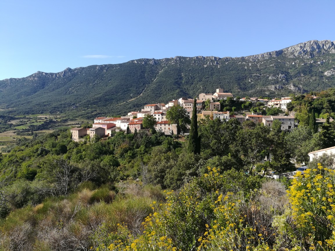 At the top of the coll, work was being done to redirect part of the trail. I later found that this work was not complete and I got stuck in a shrubby, rocky area where the trail ended. I got a bit scratched up trying to find my way out. After that, it was easier walking along some forested dirt roads into the village of Campoussy, which was very quiet and provided a short water stop. I continued the last few kilometers to Sournia. Sournia lacked a bit of character, but there was lodging and a restaurant, which was nice to have.
