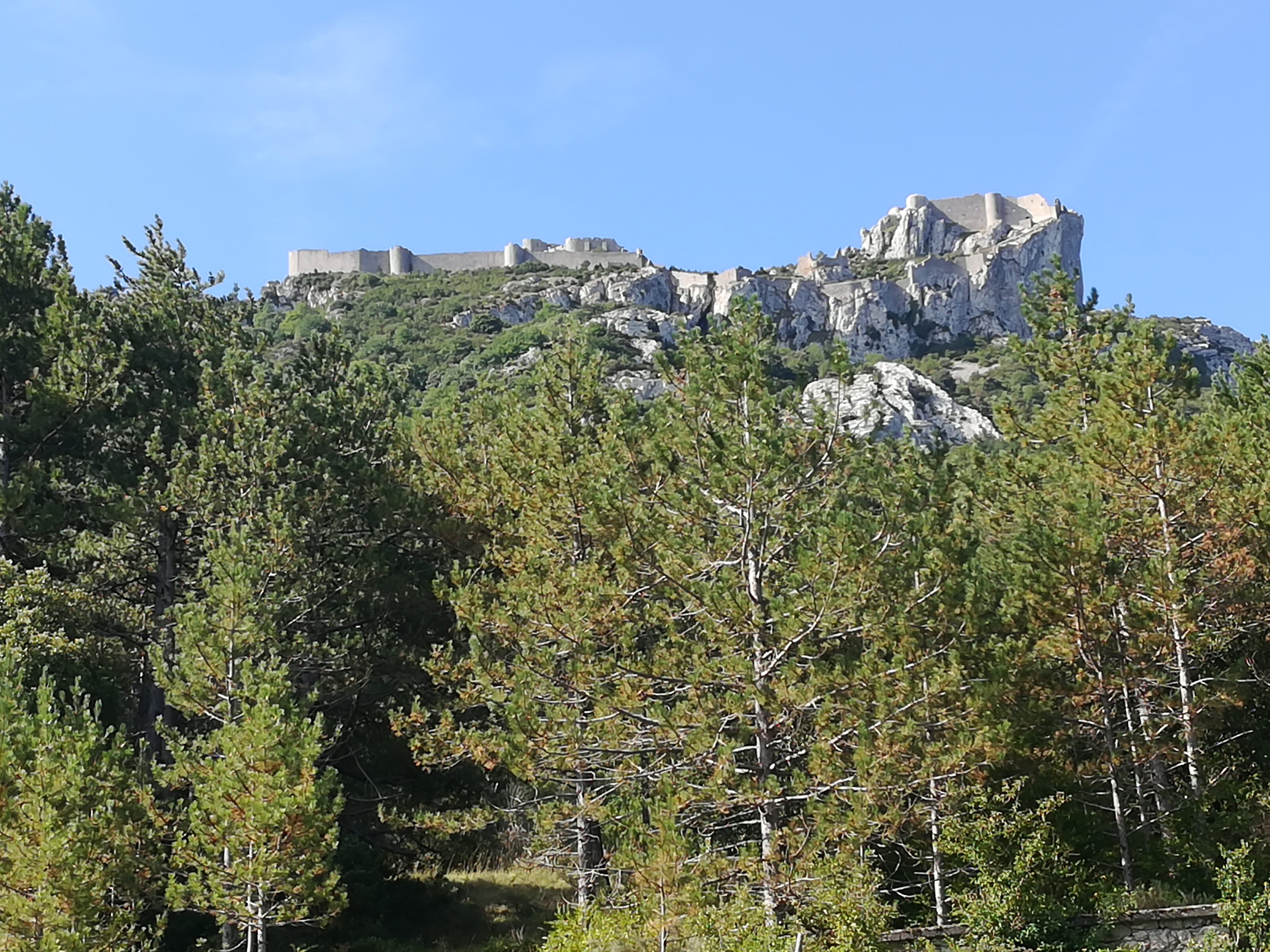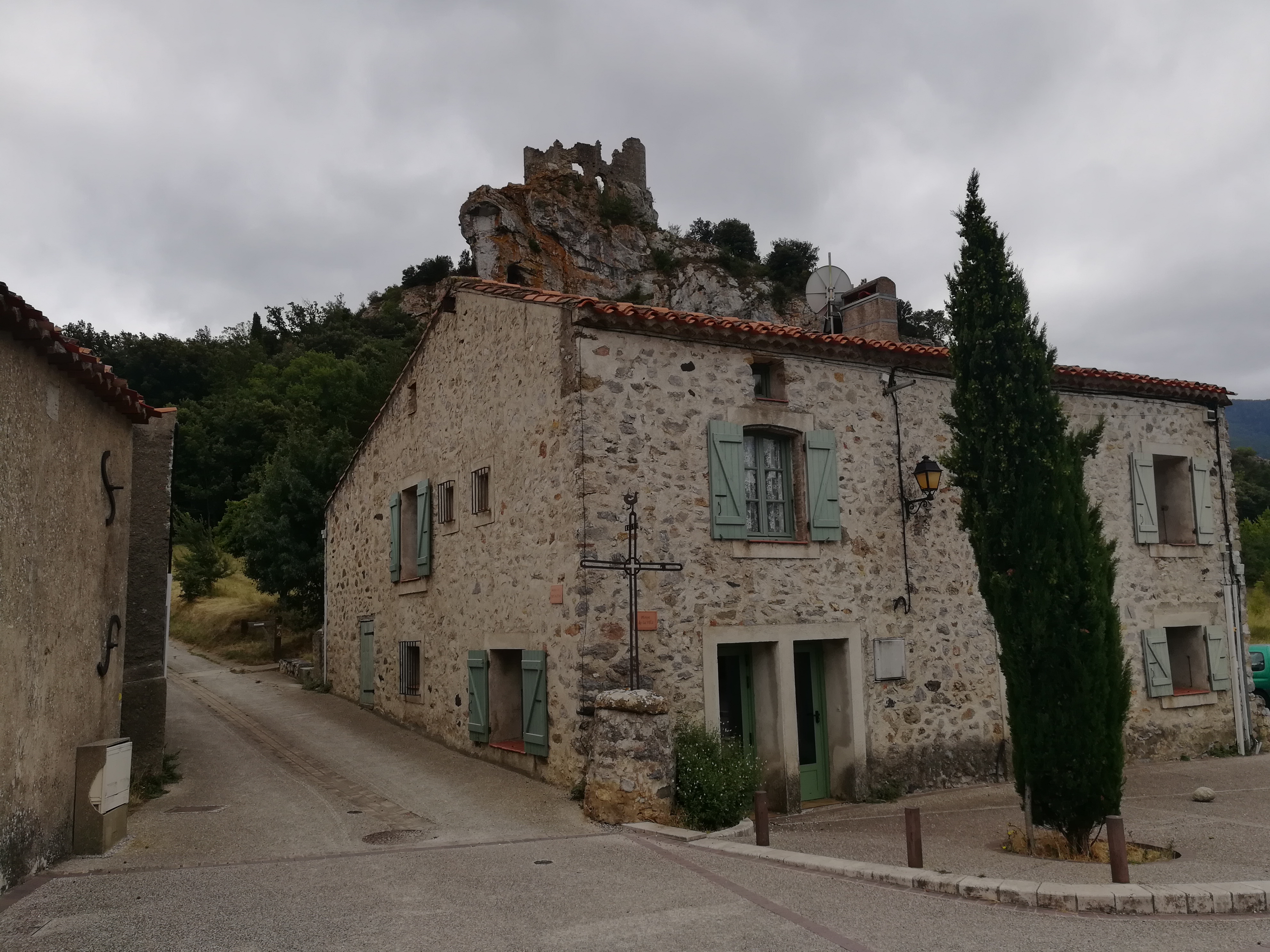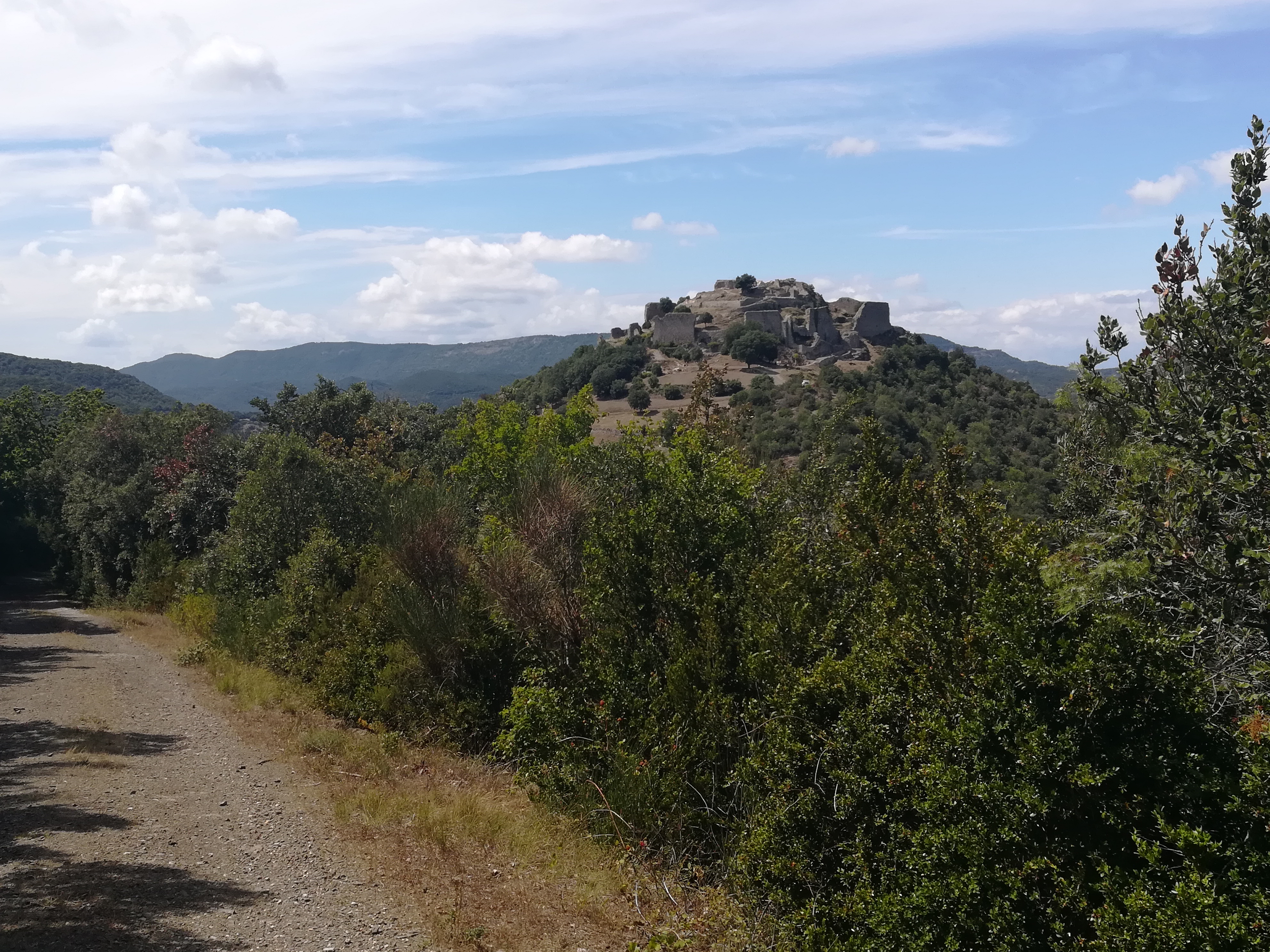 The following day, the weather had cleared, but it was very windy. The trees filtred out some of the wind, but I was really holding my hat at times. I started with a 3km walk out of Duilhac sous Peyrepertuse to Rouffiac Des Corbieres, on the opposite side of the Chateau de Peyrepertuse. I stopped there for groceries, as I was planning to camp. There was a lot of walking on fire and forest roads to the village of Mouthoumet, where I stopped for a coffee break. A long, bitumen road through farms was the first piece out of Mouthoumet, but it changed to dirt roads, and ultimately trail before dropping down into Termes. My first sight was the castle ruins on the edge of town.