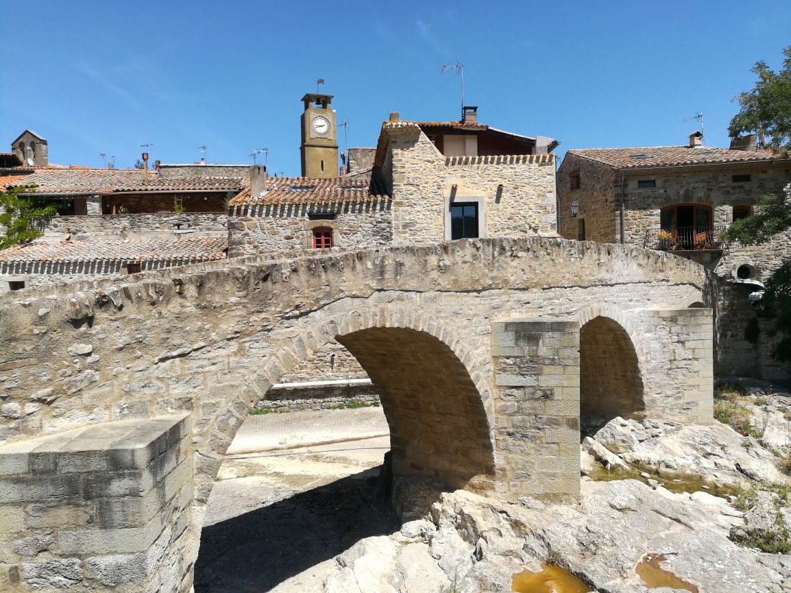 After a steady climb and descent on trails, I ran into a family from Norway that was hiking around the area, using their holiday house outside of Lagrasse as a base. I walked with them on the dirt roads over to the village of Mayronnes. This stretch of dirt roads is unusual in that it has an art walk, where pieces of art were placed alongside the road. The family stopped for a lunch break in Mayronnes, but I was keen to get to Lagrasse and kept going. I hit the small village of Caunettes en Val a few kilometers from Mayronnes, but not much going on there. No place to stop for a coffee break, so I finished the last 9km into Lagrasse. Arriving in Lagrasse, the tower of the abbey is visible from everywhere. Lagrasse is a beautiful medieval city, built with fortification along the river. The old bridge enters a narrow gap between between the buildings, which was likely guarded at some point.