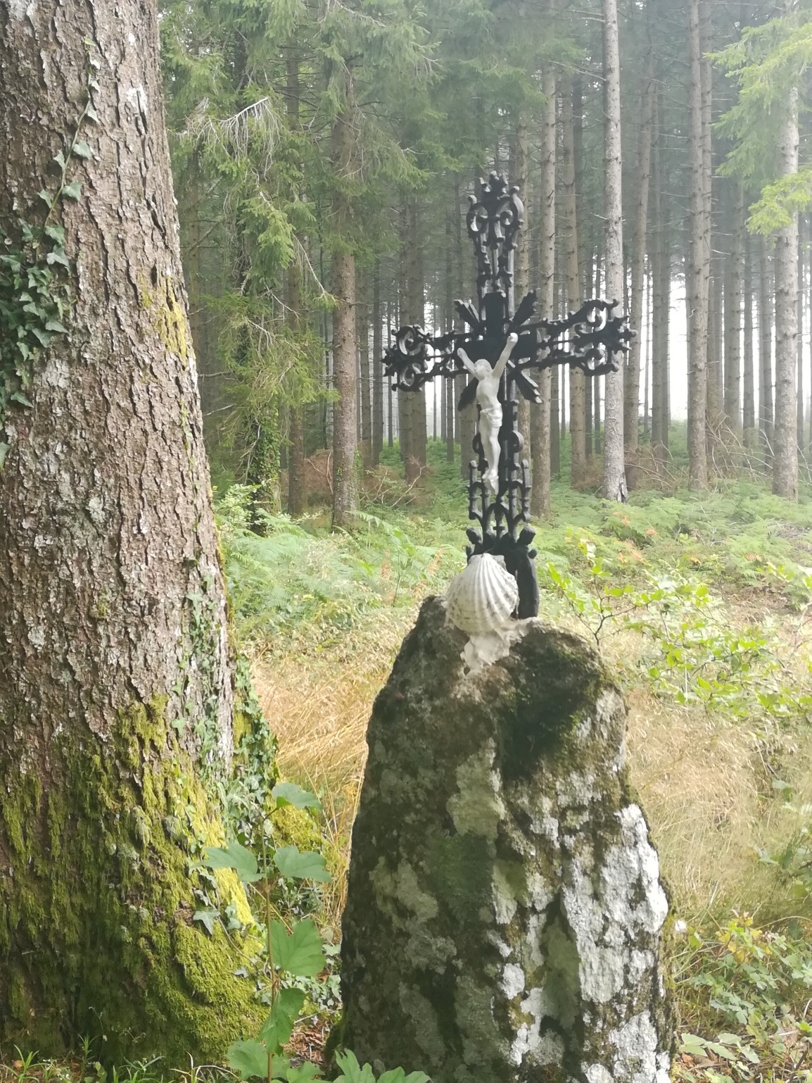 It was quite cloudy and foggy the next day, and there were supposed to be showers in the afternoon. After leaving the Mazamet area, there were amazing tracts of forests were the trees were so thick that the road ahead appeared dark. The fog made it a bit creepy, but the forests were outstanding. This part of the walk followed one of the Camino paths, and several people inquired about whether I was a pilgrim. It was also marked by frequent iron or stone crosses, adourned with the common pilgrimage symbol of the shell.