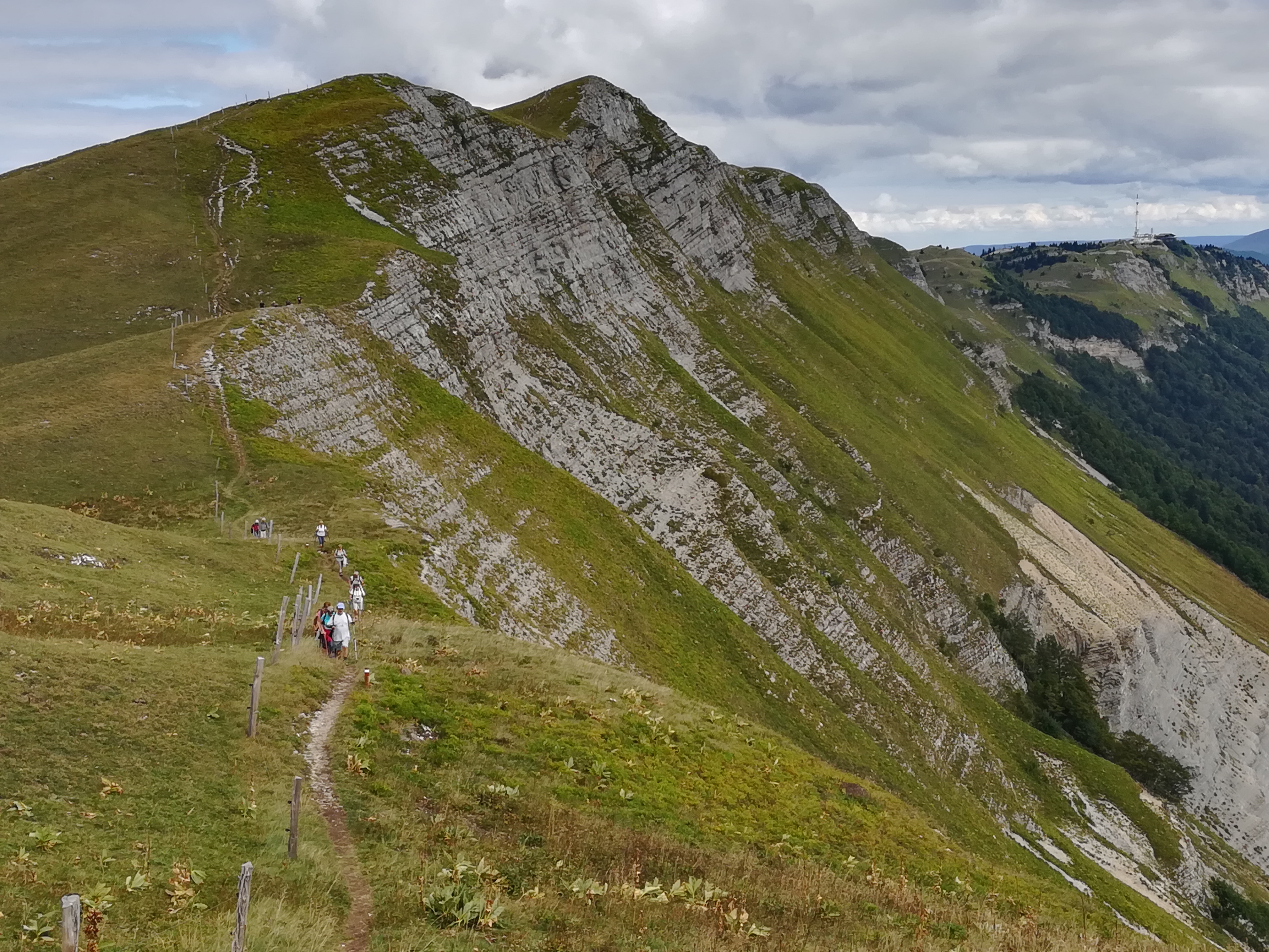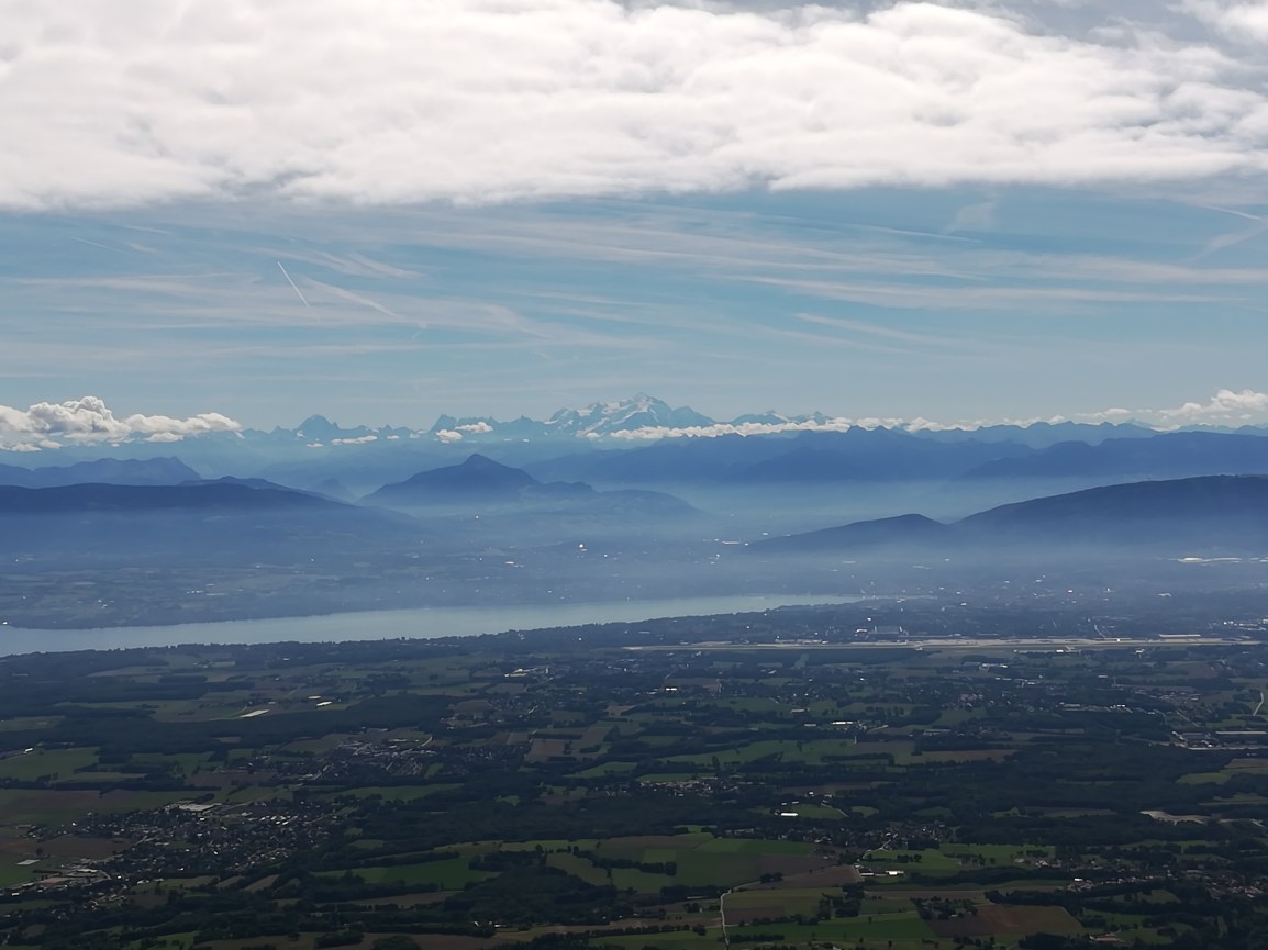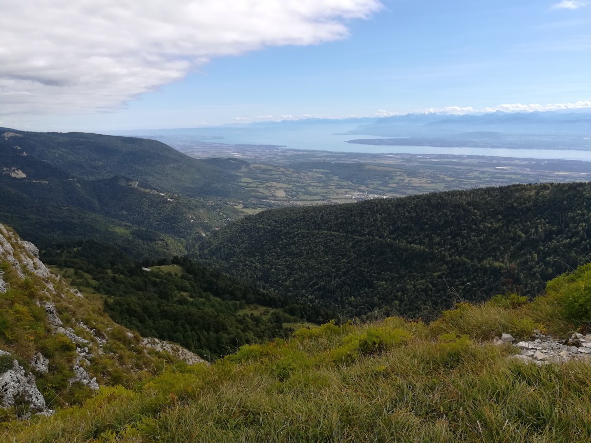 The last day in France (and first day in Switzerland) started with some steep climbs through the woods and ski fields above Lelex. The path emerged on the ridge overlooking the immense valley containing Geneva, Nyon and Lac Leman, with stunning views of the Alps. The views were best from the Colomby de Gex.