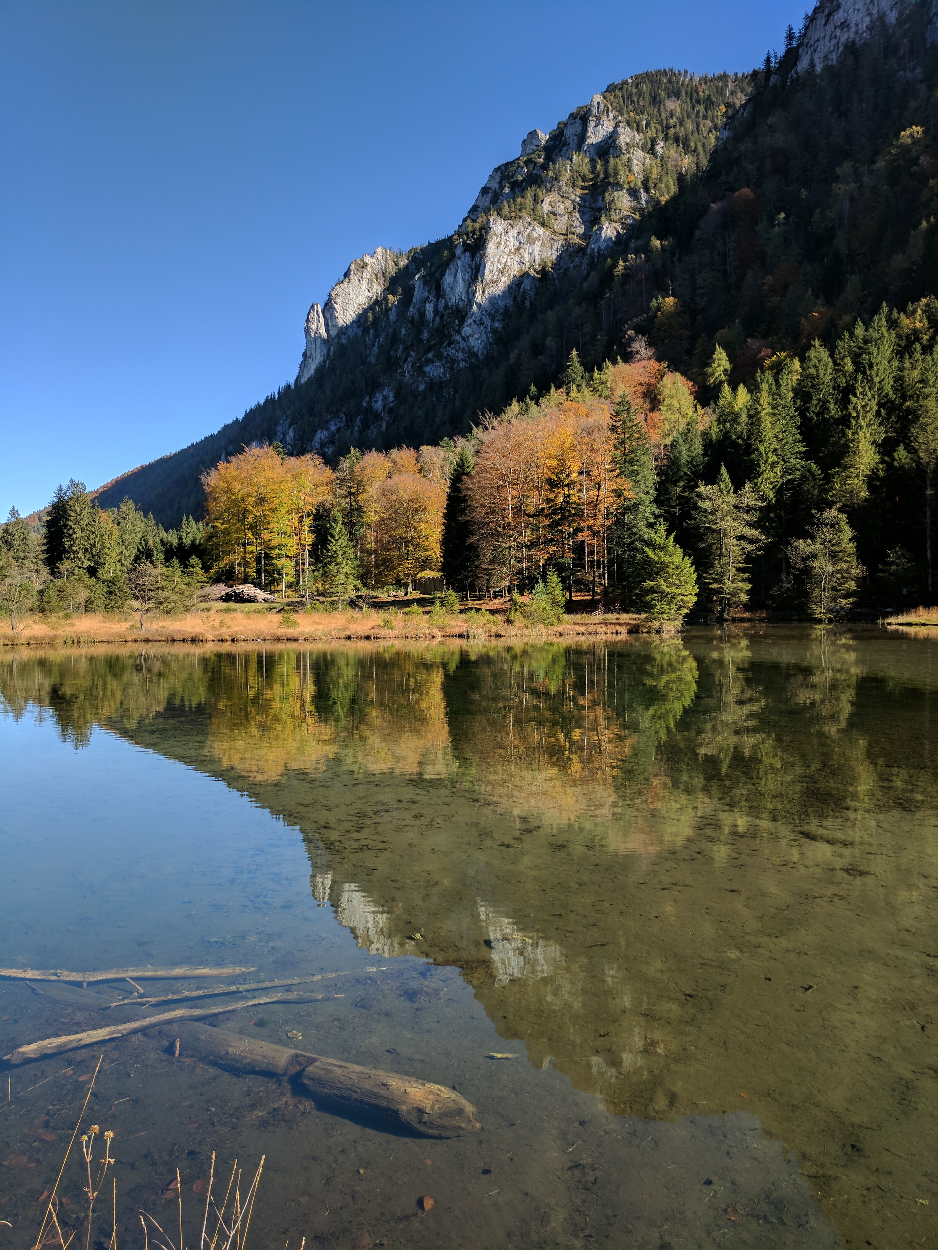 The way out of Inzell was supposed to include a high-mountain crossing, but we decided to go around since Sabine was still not feeling that well. The walk around was through a beautiful valley, and the path passed near the glossy, clear Falkensee.