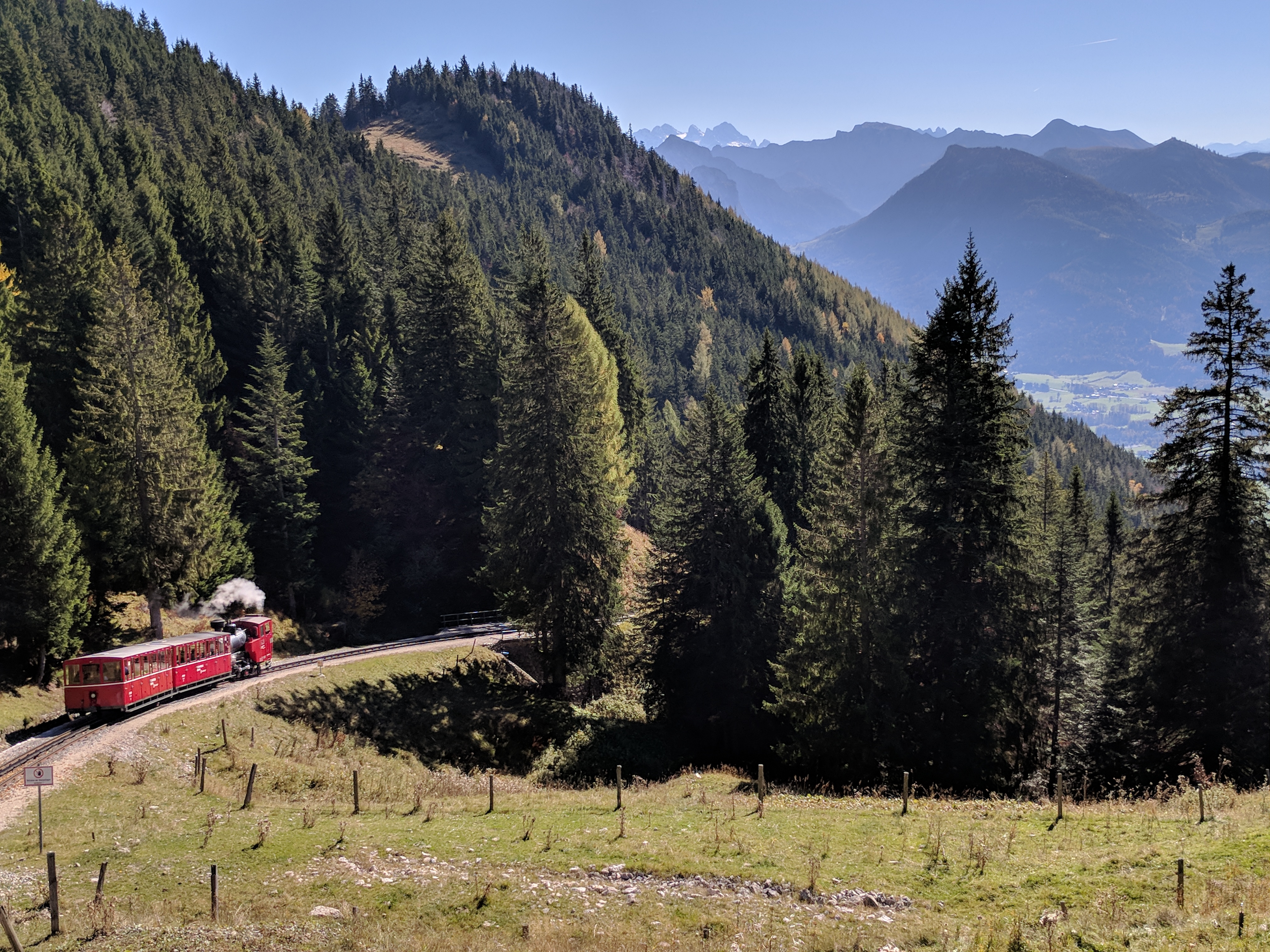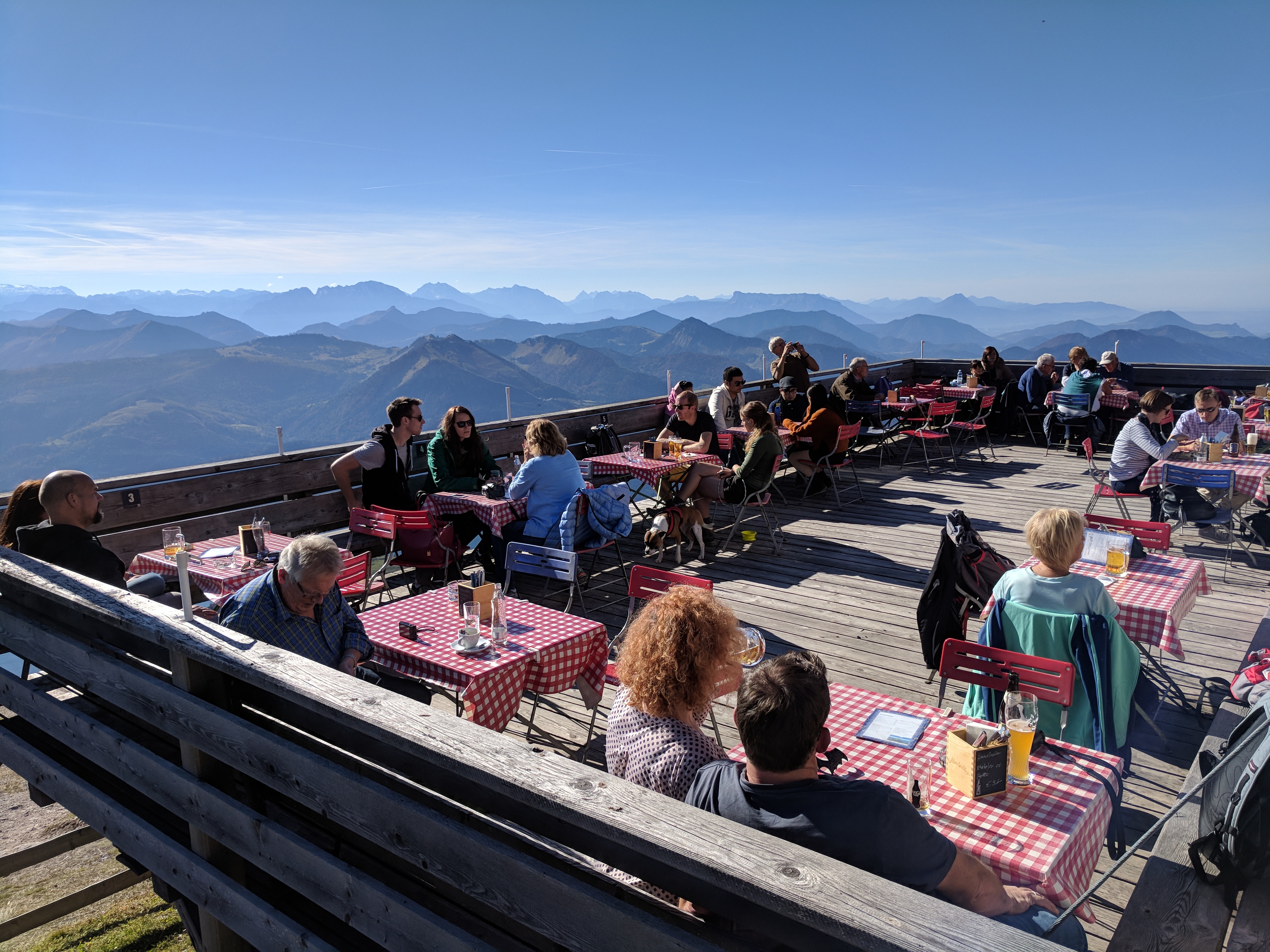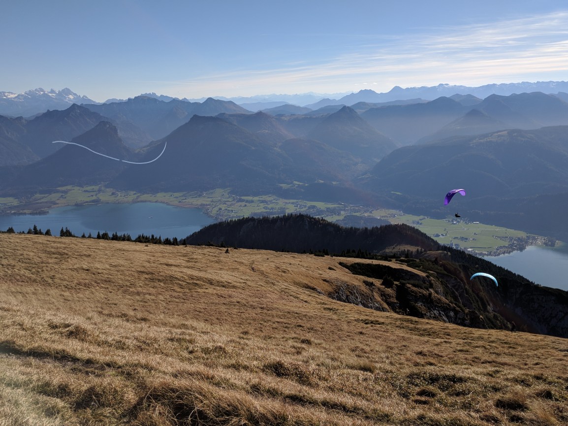 Sabine was feeling a bit better the next day, and since the weather was great we decided to complete the Schafbergspitze climb. This was the most spectacular day of our walk together. It was a tough climb for hours, but the views were well worth it. There is an alpine railway line that snakes its way to the top, which is a really amazing piece of engineering. At the top, there was a small restaurant balanced on the edge of the cliff. As we were leaving the peak, several paragliders were launching and a stunt pilot was flying in the valley below.